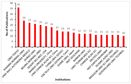 The most relevant institutions in road dust research are presented in Figure 3. Our analysis revealed that the University of Tokyo, Japan, is the most productive institution on road dust research with 36 publications. Shaanxi Normal University, China, and the University Nacl Autonoma, Mexico, were ranked second and third with 24 and 22 publications, respectively. The fourth- and fifth-ranked institutions in road dust research are Shiraz University, Iran (n = 21), and Beijing Normal University, China (n = 20). These institutions make up the five most productive institutions on road dust research globally, and they accounted for 38.80% of the first twenty institutions with the highest publications on road dust-related research indexed in both Scopus and WoS databases. It can be observed that the Chinese institutions dominated the top twenty institutions in regard to road dust research (Figure 3), and this result corroborates our observations of some of the bibliometric indices previously reported in Figure 1.