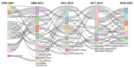 To comprehend the evolution of research on road dust over time, the different keywords during different time intervals were evaluated in the ranges of 1906–2005, 2006–2012, 2013–2016, 2017–2019, and 2020–2020 (Figure 4). It was observed that before 2005, research on road dust was mainly focused on air pollution and dust generally. ICP-MS, PM10, PAHs also dominated this period. Between 2006 and 2012, the research focus was limited to dust from roadsides as inferred from the dominance of keywords such as street dust, road dust, PM10, ICP-MS, trace element, air pollution, metals, and sources. In addition, from 2013 to 2016, road dust and street dust, heavy metals, spatial analysis, enrichment factors, and trace elements were dominant keywords during this period. This is an indication that focus on this type of study has now been streamlined to the detection of heavy metals as a pollutant type in road dust. Moreover, analysis of the presence of heavy metals in road dust was observed during this period. Between 2017–2019 and 2020, the analysis of heavy metals in street dust became very prominent, as these keywords, as well as their source identification and spatial analysis, were observed to take the lead during these periods. Other keywords observed during these stages include PM10, PAHs, urban pollution, optimization, and bioaccessibility.