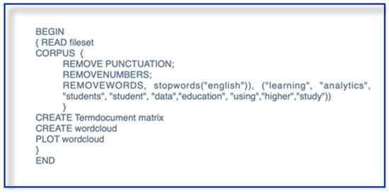 The search query is simple and only includes the term Learning analytics in the title and student data in the body text as the contextual boundaries. A time window of three years (2017–2020) is the temporal boundary. Using text mining methods, (1) the titles, (2) abstracts and (3) the related keywords are retrieved. These three datasets are processed and presented as word clouds. The idea of creating three separate word clouds is to make sure the LA terms that are used in each of the articles are not missed. The word clouds for titles abstracts and keywords are created using the algorithm presented in Figure 2.