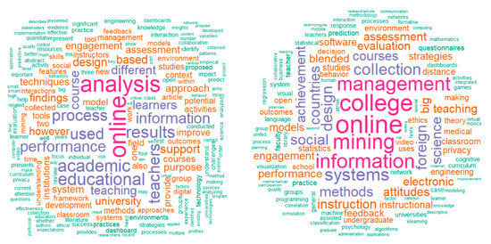 As the clouds of titles, these two clouds in Figure 4 include the term “online” as the most frequent term. For the keywords, online learning could be the main area, as well as “data mining”. Therefore, these results indicate that the LA field prioritizes “online” settings and data. “Student engagement”, “learning process”, “academic performance” are the main discussion points in the abstracts. “Data mining”, “information management”, “systems design” etc. stand out as keywords. However, there are no terms related to the lawful and ethical use of data that appeared in any of the clouds, although plenty of articles in the corpus considers predictive modelling and student behaviour data.