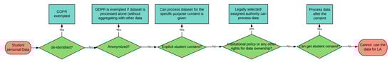 An important application of LA is to count on “new” information discovered as a result of processing student data to perform “relevant interventions” to student learning [1,2,5]. The word cloud of LA literature presented in [43], for example, shows interventions as a prominent keyword. As an essential part of interventions, the individual data subjects (students) need to be explicitly identified, algorithmically or manually, which deteriorates the meaning of anonymization of data [44]. As [8] mentions, de-identification of data is a step forward in the process of anonymization of data and refers to all the identifiable measures of individuals after aggregating data from many sources. This is a way out of GDPR, but it is a challenging and mathematically expensive process. The same article further questions how useful the de-identified data is, meaning that a well de-identified dataset might not be usable for enhancement of personalized learning, and hence, anonymized data does not showcase the full power of LA. Therefore, in occasions of collecting personal data for LA purposes, the explicit consent of the data subject is sought.