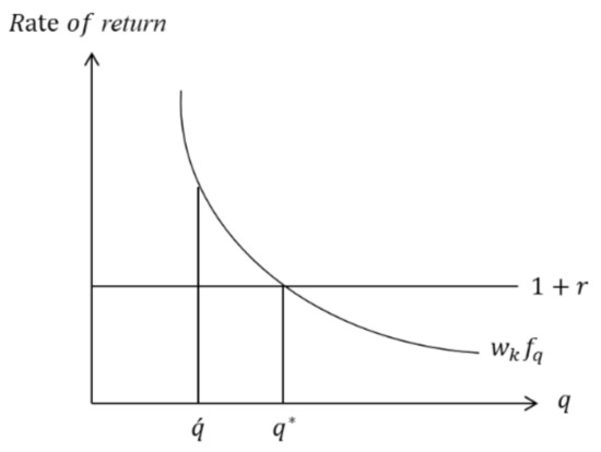 In the first period, is the parent’s human capital level, which varies across families, and they receive the after-tax wage, . , indicates the proportion of time parents need to invest in raising each child and, therefore, is the parents’ working hours. Income is mainly used for consumption, , savings, s, and investments in the child’s human capital, q. In the second period, the parent’s after-tax rate of return to savings, , is used for their own consumption, , and a bequest, b, to a child.