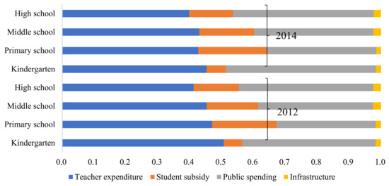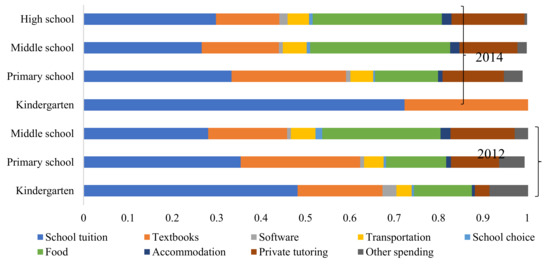 Figure 9 and Figure 10 depict the proportions of private education expenditures and public education spending for all school levels. In kindergartens, household spending consisted mainly of school tuition and textbooks, and school tuition increased by 70% in 2014. The proportions of expenditures in the primary schools did not change much between 2012 and 2014; school tuition and textbooks were the main expenses, and food expenses and private tutoring were the lower expenses. The spending in the middle schools was similar to that in the high schools, and the largest proportions were for school tuition and food expenses, while textbook expenses were relatively low compared with the other stages, and the proportion of private tutoring was greatly increased. With the improvement of children’s education, family education expenditures were also more diversified, mainly comprising school tuition and textbooks, and including a variety of expenditures.