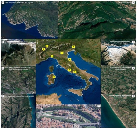 Starting from this premise and depicting the state of the art regarding geoheritage mapping, this paper aims to: (i) propose a targeted legend and related symbols for detailed geomorphological mapping of those landforms that have been classified as geosites; (ii) test the proposed legend within different geological and geomorphological contexts; (iii) test the proposed legend and related symbols at a different scale; and (iv) elaborate guidelines for mapping geosites and integrating the new symbols within geomorphological legends in the specific case for the Italian territory. In this paper, the proposed legend is illustrated by means of nine case studies (Figure 1) developed by the AIGeo Working Group “Geomorphosites and Geodiversity” and testifying for the high geodiversity of Italian landscape [78].