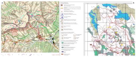 Examples of geotourism map for amateurs of Earth Sciences. (a) Excerpt from the leaflet of the geological-geomorphological itinerary in Val Badia (Dolomites, Italy) (modified after [79]). (b) Excerpt from the Geo-hiking Map of the Mt. Penna and Mt. Aiona area (Aveto Natural Park, Italy) (modified after [80]).