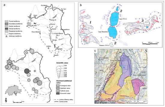 Examples of map for specialists: (a) small-scale map showing the score of the numeric scientific evaluation (size of the circles) and the dominant additional values (circle’s shading) for each geomorphosite (modified after [86]); (b) simplified geomorphological map representing three areal-type geomorphosites of the Adamello-Brenta Nature Park (Italy) (modified after [1]); (c) simplified geomorphological map representing the geomorphological features of a complex geomorphosite (modified after [87]).