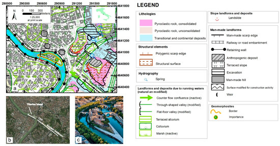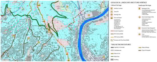 Still, there are few geoheritage maps for specialists, such as documents elaborated by scientists and very useful for public boards in territorial planning and management (e.g., Environmental Impact Assessment, Geomorphosites inventory, Geopark management). In these kinds of documents, interest is mainly given to the representation of: (i) the scientific and additional values (e.g., [64]); (ii) the boundaries of the geosites [5]; and (iii) other features of interest (e.g., naturalistic, historical, archaeological elements, etc.) in the surrounding area, especially in maps representing protected areas (Figure 4, or urban contexts where geosites could be particularly impacted by human activities (Figure 5) [12,39]. Furthermore, there are numerous examples of small-scale maps in which geosites are represented by small graphic symbols, usually punctual, on topographic or geological maps (e.g., [85]). These documents, which are often implemented as complementary products to regional surveys, are to be considered mainly as index maps, useful for understanding the spatial distribution of geosites.