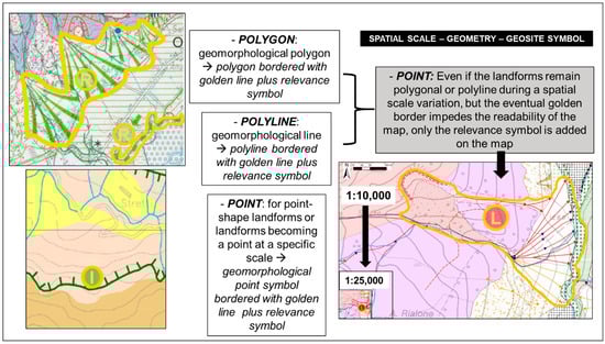 As the graphical representation changes with the spatial scale of the map, we decided to focus the proposal to the scale 1:25,000–1:50,000, which are the common scale for geomorphic surveys and mapping at national scale level, corresponding to the official geomorphological maps by ISPRA covering the Italian territory [58,77].