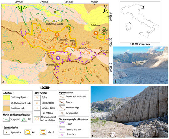 Geomorphological map of the composite geosites of Mt. Canin (a); Canin glacieret, May 2012 (b); solution groove at Col delle Erbe plateau (c).
