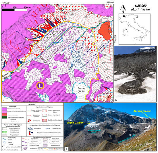 This complex geomorphosite is located along the Alpe Veglia Glaciological Itinerary [30], in the Lepontine Alps (Figure 1, site 02). The area is interested by the outcrop of rocks of the Lower Pennidic nappes, the deepest part of the Alpine orogeny. The lithotypes characterizing the area are mainly represented by massive and foliated metamorphic rocks, including [130]. From a geomorphological point of view, the area is dominated by glacial and paraglacial processes (Figure 9b) (sensu [118]) since glacial dynamics are gradually leaving space to water- and gravity-related processes favoured by deglaciation. The area has been selected as a representative case study for morphodynamics of a proglacial system. In particular, the proglacial areas related to the Aurona and Leone Glaciers constituting the system are undergoing a progressive widening since the glaciers, characterized by different dynamics, are fast retreating (Figure 9c).
