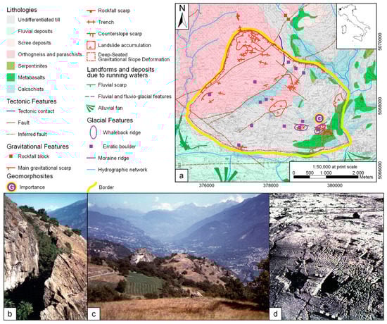 (a) Map and legend illustrating the Croce di Fana and Vollein complex geomorphosites (Central Aosta Valley, Western Italian Alps). (b) Large trench affecting glacially smoothed bedrock within the Croce di Fana large slope instability (c) Vollein whaleback ridge displaced by Deep-Seated Gravitational Slope Deformation; (d) Prehistoric rock carvings over the glacially smoothed bedrock at Vollein archeological site.