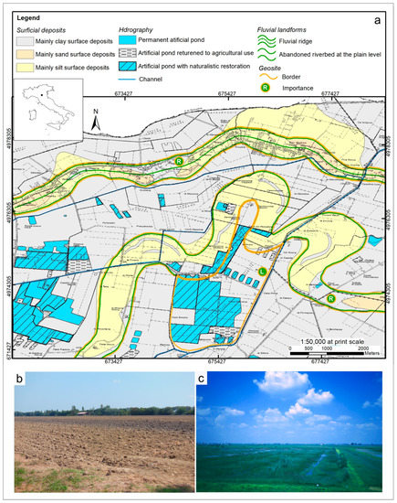 (a) Geomorphological map and location of the simple fluvial geosites: “Gavello fluvial ridge” in the northern sector of the maps, the Barchessoni palaoriver in the centre and the “Valle Le Partite” located between the meanders of “Barchessoni palaeoriver. Pictures represent the Barchessoni palaeoriver (b) and the Valle Le Partite area (c) from a frontal perspective.