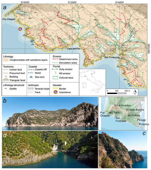 - Brandolini, P.; Faccini, F.; Robbiano, A.; Terranova, R. Geomorphological hazards and monitoring activity along the western rocky coast of the Portofino Promontory (Italy). Quat. Int. 2007, 171–172, 131–142. [Google Scholar] [CrossRef]