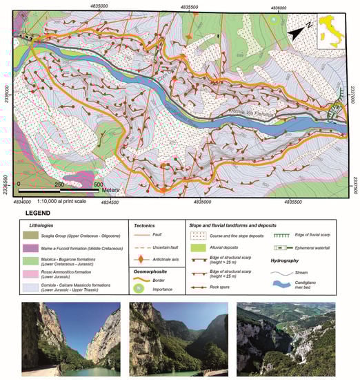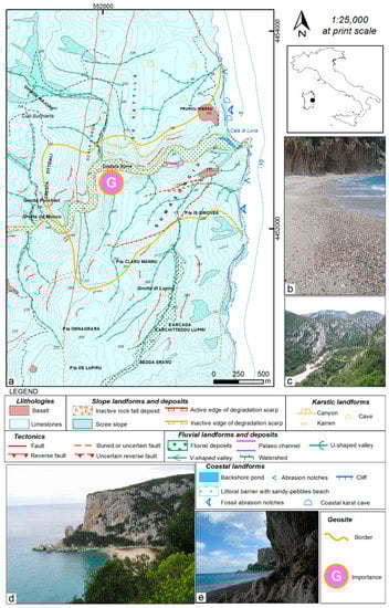 Geoheritage mapping is a quite recent research topic (e.g., [1,2,3,4]), and there are few examples especially addressed to land planning (e.g., [5]). According to this last purpose, geomorphological mapping is now assuming a crucial role in supporting geoheritage management due to its valuable contributions for both enhanced fruition of cultural landscapes and assessment of environmental dynamics within geosites of diverse nature. Geomorphological mapping developed after World War II, mostly in Europe, Japan and Canada [6], and flourished in different countries with various aims especially during the 1960s to the 1980s. Then, it rapidly proved to be a fundamental activity within Geoscience research, since geomorphological maps became an invaluable tool of both scientific [7] and practical significance in terms of fallouts on society (e.g., [8,9,10,11,12]). A geomorphological map constitutes a strong scientific and dynamic source of information on landforms, their origin and evolution (i.e., degree of processes activity), and it can be used to understand how those landforms combine in space and time to generate complex landscapes.