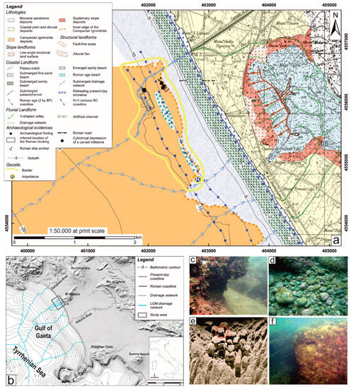 - Pennetta, M.; Stanislao, C.; D’Ambrosio, V.; Marchese, F.; Minopoli, C.; Trocciola, A.; Valente, R.; Donadio, C. Geomorphological features of the archaeological marine area of Sinuessa in Campania, southern Italy. Quat. Int. 2016, 425, 198–213. [Google Scholar] [CrossRef]