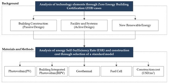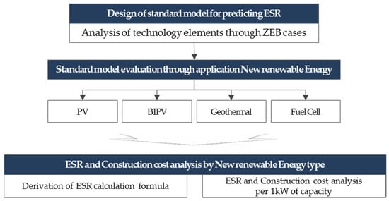 In view of the above, this study investigates the ZEB cases in Korea in order to predict the ESR of the major new renewable energy types and analyzes the ESR and construction costs of these energy types by selecting a standard model. Furthermore, the ESR formula for each major new renewable energy type is derived to allow the construction stakeholders (building owner, architect, and builder) to assess the optimal share of new renewable energy at the design stage, which is neither excessive nor insufficient. The flowchart of this study is presented in Figure 1.