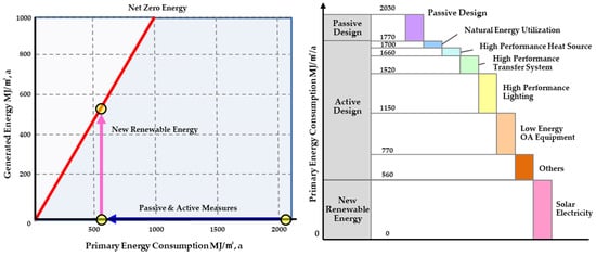 Hence, a zero-energy building can be regarded as a building that achieves energy independence by balancing its energy consumption and production. Such buildings aim to minimize energy consumption through passive technology elements related to the construction and active technology elements associated with systems and electricity, and maximize energy production through new renewable energy, increasing the ESR [22]. The concept of a zero-energy building is illustrated in Figure 2 [12,22].