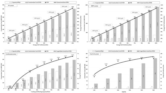 - For the fuel cell system, the ESR per 1 kW was 1.46%, and the construction cost was 26,000 USD. The rate of increase of the ESR decreased with the increase in the capacity, and Equation (5) was derived using a logarithmic trendline.