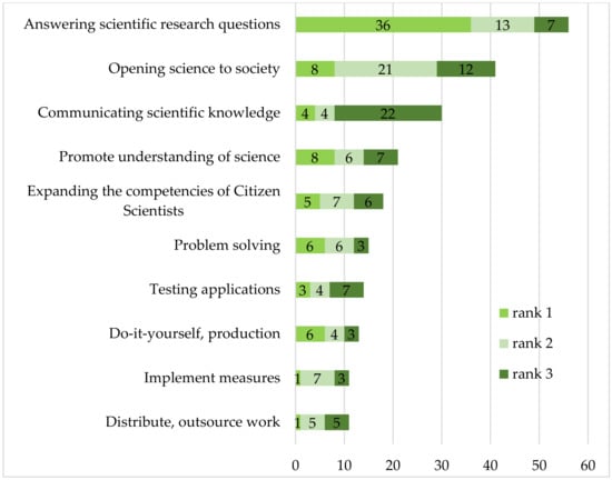When asked about the overarching project goals, “answering scientific research questions” was selected by thirty-six projects (46.2%) as the most important goal, thirteen projects named it as the second most important goal (16.6%), and another seven projects named it as the third most important goal (8.9%; see Figure 1). This results in the first rank in the overall weighting. These are followed, but already at a clear distance, by “open science to society”, “communicate scientific findings”, and “promote understanding of science”. These first four meta-goals can in turn be assigned to two core aspects of citizen science: creating knowledge and sharing knowledge.