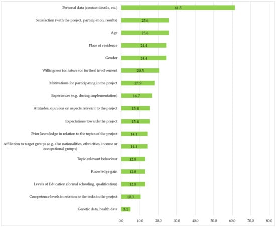 We were interested in what information was collected about the citizen scientists involved in the projects. Figure 2 shows the total of 17 presented options. The projects selected between one and 14 options (on average 3.4). 61.5% of the projects collected personal data, including contact details. This was followed, at a great distance, by the recording of satisfaction (for example, with the project, with participation, or with the results (25.6%)). Just under a quarter of the projects recorded age, gender, or place of residence (25.6%, 24.4%, and 24.4%, respectively) and even fewer projects asked for affiliation to target groups (e.g., nationalities, ethnicities, income, or occupational groups, 14.1%).