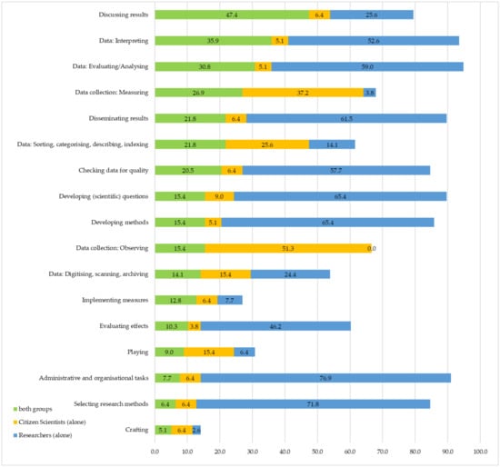 The organisation and allocation of various scientific tasks in the projects. N = 78. The percentages indicate the respective distribution in the projects sorted in descending order according to the distribution in both groups (green bars), citizen alone (orange), or researchers alone (blue).