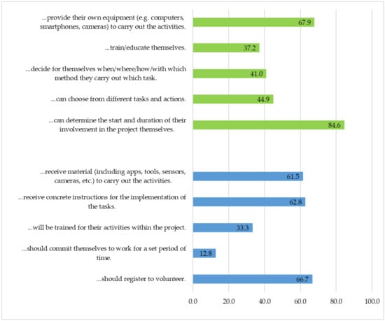 Because we do not have representative studies on citizen science in Germany, we take briefly examine Great Britain and Switzerland. Pateman, Dyke, and West 2015 examined in a study representative of the United Kingdom which groups of people participate in citizen science projects; 8220 people were surveyed, of whom 613 (i.e., 7.5% of the total sample) reported having participated in a citizen science environmental project, and 321 participated in more than one project. People who identified themselves as belonging to white ethnic groups were more likely to participate than those who identified themselves as belonging to ethnic minority groups; participation by ethnic minority women was particularly low. Participation among members of white ethnic groups decreased with socio-economic status, while this was not the case for members of ethnic minorities. Participation was highest among those in education (at school, college, or university) and lowest among the unemployed []. A recent study, which is also representative, investigated the willingness of the Swiss resident population aged 18 and over to participate in research. For this purpose, 1394 interviews were conducted: 15% of the respondents were familiar with the term “participatory research”, and 5% of them had already taken part in a participatory research project. Overall, high potential can be seen, as 48% of the respondents could imagine participating in participatory research projects. Younger people, people with a higher education, and people with an openness to scientific topics are particularly interested. There are no significant urban/rural differences [].