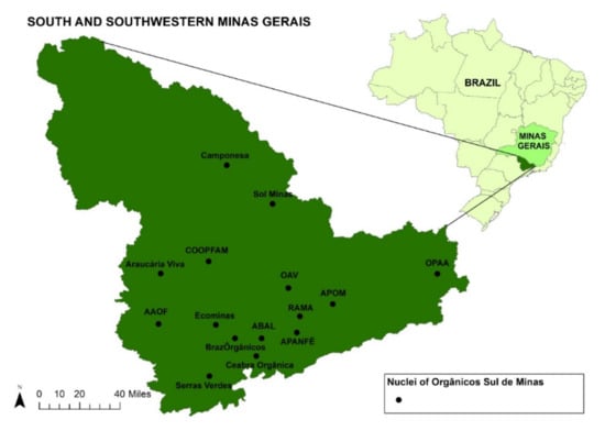 This OPAC was established on 27 November 2012, and it has initiated an organization to create the first PGS in the state, thus awakening the interest of partner institutions in supporting the initiative through extension actions. The region where the OPAC “Orgânicos Sul de Minas” (hereafter OPAC-OSM) was established is the south and southwestern Minas Gerais region, popularly called “Sul de Minas”, and includes 146 municipalities, with an effective population of 2,929,424 people [
