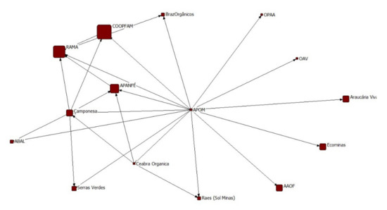 Figure 2), it appears that there is no direct relationship between the organisations’ physical distance and the level of consultation between them. For example, APOM has a great ability to keep the network united even if it does not have a central position with respect to other organizations. Among the most distant organizations, while Camponesa has a good level of interactive information, others do not, such as OPAA and Araucária Viva.