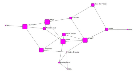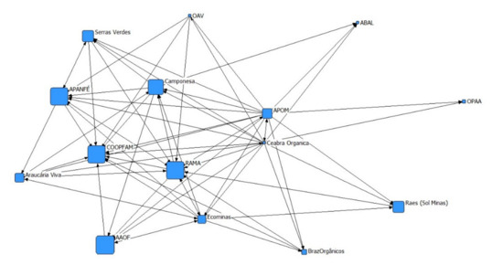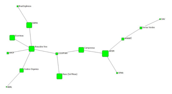 41]. In the case under study, it would appear that trust is an effect of SC which has its roots in shared values, and at the same time a constituent factor fueled by the cooperative behavior of individual members. In the trust network, what emerges is the role assumed by some partners, including the aforementioned AAOF, Rama, Coopfam, Camponesa, in addition to Apanfè, Auracaria Viva, APOM and Serras Verdes. As already mentioned, the fact that the collaborative network is less dense highlights that trust and information relationships are drastically reduced when they turn into concrete collaborations. But we must also keep in mind the structural characteristics of the Brazilian territory and of the agricultural organic sector, such as the long distances and the limited size of farms, which seem to have a negative impact on SC, according to the results. The distance between the members of the OPAC-OSM also influences the level of conflict between them, which seems inversely proportional. It should be noted how some of the members play a more strategic role, both in terms of the absolute number of active collaborations (Araucaria Viva), and the ability to keep the network united (Coopfam and APOM).