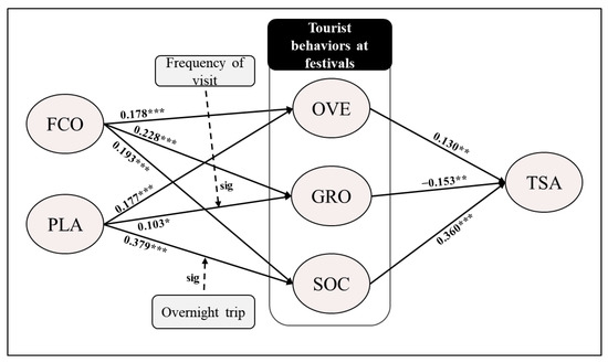 Figure 2 provides the results of the estimated structural model with the standardised path coefficients. The path model analysis showed that Hypothesis 1 was significantly associated as we posited. Interestingly, face consciousness had positive (+) impacts on tourist behaviour at festivals. The path coefficient of face consciousness and overacting behaviour was 0.178 (p < 0.001), that of face consciousness and grooming behaviour was 0.228 (p < 0.001), and that of face consciousness and social behaviour was 0.193 (p < 0.001).