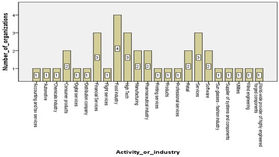 The organizations were chosen based on the lists of organizations that have implemented ERP systems, which is presented on the websites of ERP system providers [30,31,32,33,34]. The organizations subject to analysis carried out their activity in different fields, these being presented in Figure 2.