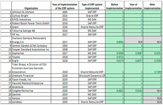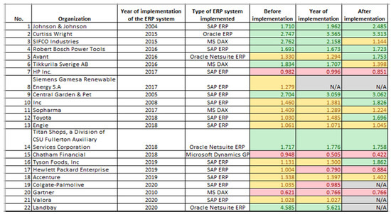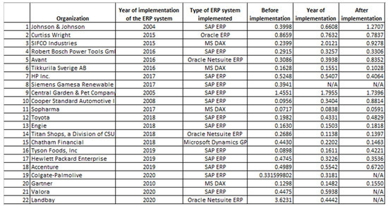 In order to identify the year of implementation of the ERP systems within the organizations, the authors consulted the annual reports published on the organizations’ websites or specialized websites where the managers of the organizations offered interviews about the effects of ERP system implementation within the organization In total, 15 organizations were not considered in the final sample due to data limitations.