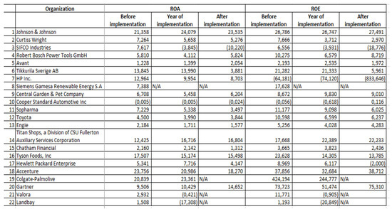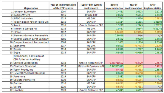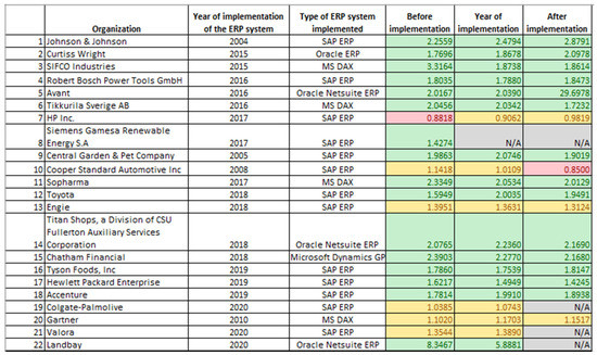 - Galy, E.; Sauceda, M.J. Post-implementation practices of ERP systems and their relationship to financial performance. Inf. Manag. 2014, 51, 310–319. [Google Scholar] [CrossRef]