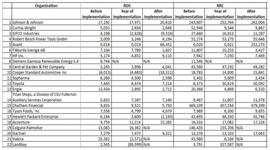 The purpose of rates of return is to measure the efficient use of the organization’s resources to finance its activity. According to [67], rates of return are defined as “a ratio between an indicator of results (profit or loss) and an indicator that reflects an activity flow (net turnover, resources consumed) or a stock (equity, total assets)”. In Figure 8 and Figure 9, we calculate the rates of return based on the data collected from the annual reports of the selected organizations in the sample. Some information is not available in the annual reports (for example, Siemens Gamesa Renewable Energy S.A.), and in some cases, the most up-to-date annual report after the implementation year is not available (for example, Colgate-Palmolive, Valora, Landbay); thus, such information is replaced by “N/A”.