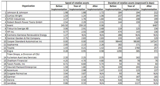 According to the data presented in Figure 10, we noticed a higher speed of rotation of assets and a lower duration of rotation of assets (for example, the Avant organization before the implementation of ERP systems had a very fast speed of rotation of assets of 245.50 rotations, so the assets can be rotated in a single day; on the other hand, a very low rotation speed of 0.004 rotations was displayed by the organization Cooper Standard Automotive Inc., in which the duration of the rotation of assets was 98,449 days). The acceleration of the rotation speed determines a favorable improvement in the performance of the organization, and its slowing down has a negative effect.
