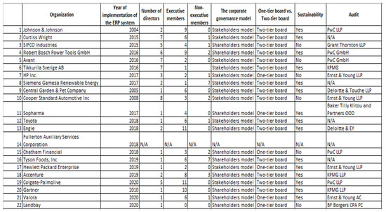 We accessed the official pages of ERP systems [30,31,32,33,34] in order to identify a sample of organizations that have implemented the selected ERP systems. The sample includes 37 organizations operating in various fields such as the pharmaceutical industry, food industry, chemical industry, providers of high-tech products, suppliers of IT systems and components, as well as utilities, retail, aviation, financial and accounting services.