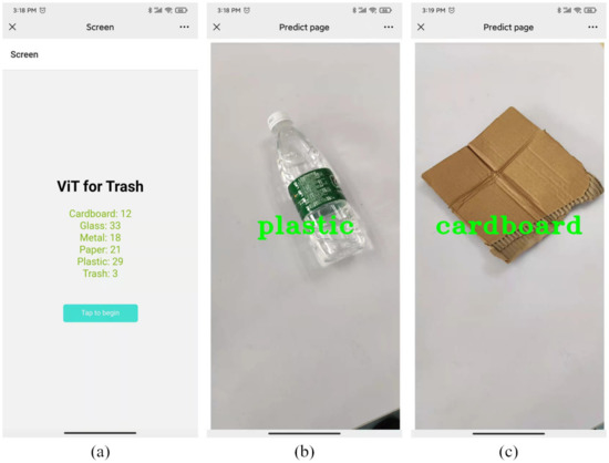 Examples of vision transformer-based waste classification on a portable device. (a) is the main interface of the mobile terminal, (b) is the recognition result of plastic bottles, (c) is the recognition result of cardboard.