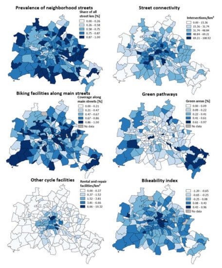 | Prevalence of Neighborhood Streets (Percentage Share of All Street km) | Street Connectivity (Intersections per km2) | Biking Facilities along Main Streets (Percentage Coverage) | Green Pathways (Percentage in Area) | Other Cycle Facilities (Rental and Repair Facilities per km2) | |