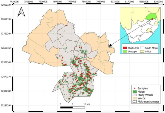 Soil nitrogen samples were collected from the smallholder maize farms of Makhuduthamaga district located in the northern part of South Africa (Figure 2). This district has a low elevation (799–1047 m) in the northwestern part and a higher elevation (1295–1791 m) in the central and southern parts. The topography is undulating with rock habitats such as rock outcrops, rocky ridges, and rocky refugia []. This district was selected because most of the rural population are smallholder maize farmers; they farm mainly for subsistence and partially for selling in local markets. Smallholder maize production is predominant in the southern part of the district []. The farmers add manure to their fields in November. Maize is planted during December and January. The growing period is between February and May. Harvesting takes place in June and no maize is present in the smallholder farms during July–November. The smallholder farms in the district are rain-fed. The annual rainfall is 536 mm with an average annual temperature of 7 °C in winter and 35 °C in summer according to the Agricultural Research Council stations located in Nchabeleng, Ga-Rantho, and Leeuwkraal areas.