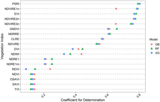 Spectral indices were generated from the Sentinel-2 bands. The vegetation indices that are included in the current study were selected by fitting the RF, XG, and GB machine learning regression models. Vegetation indices that optimized the coefficient of determination (R2) in relation to the nitrogen content for each model were retained. This procedure was done because similar studies have reported a diverse range of vegetation indices [,,]. The vegetation indices evaluated based on the RE were the following: Normalized Difference Vegetation Index RE 1, 2, and 3 narrow (NDVIRE1n, NDVIRE2n, NDVIRE3n), Normalized Difference Vegetation Index RE 1 (NDRE1), Normalized Difference Vegetation Index RE 1 modified (NDRE1m), Modified Simple Ratio RE (MSRRE), Chlorophyll Index RE (CLRE), and Normalized Difference Vegetation Index RE (NDVIRE). Other indices based on the NIR, SWIR1, SWIR2, and visible parts of the electromagnetic spectrum were also evaluated. These indices included the Plant Senescence Reflectance Index (PSRI), Enhanced Vegetation Index (EVI), and the Green Normalized Difference Vegetation Index (GNDVI). Additionally, the Difference Vegetation Index (DVI), Normalized Difference Water Index (NDWI), Renormalized Difference Vegetation Index (RDVI), Normalized Difference Vegetation Index (NDVI), Optimized Soil Adjusted Vegetation Index (OSAVI), Soil Adjusted Vegetation Index (SAVI), and Triangular Vegetation Index (TVI) were also evaluated. The final spectral indices used in this study are summarized in Table 3.