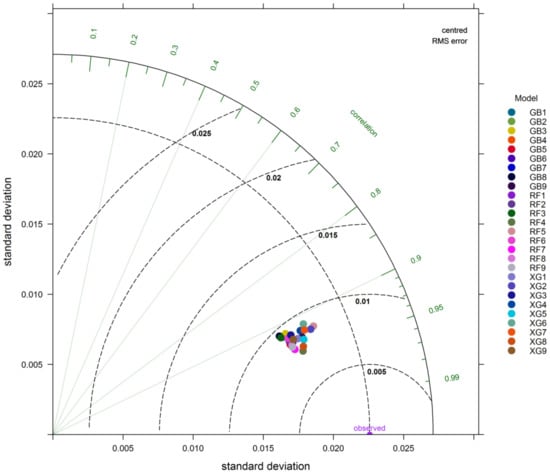 The Taylor diagram in Figure 4 was used to verify the model performance. All models had high correlation coefficients ranging from 0.91 to 0.95 and they plotted close to the observed reference value at the origin. Additionally, they had a similar performance shown by the clustering of points with the same location on the Taylor diagram []. However, the RF4 model had a slightly better performance compared to the other models based on the lowest standard deviation and root mean squared (RMS) error. The correlation coefficient was also high for this model, signifying a good fit between the observed and predicted values. The XG8 and GB4 models were the optimal performing models for the XG and GB models. They had a considerably lower standard deviation and RMS values but a high correlation. Additionally, the predicted values from these models were closer to the observed values.