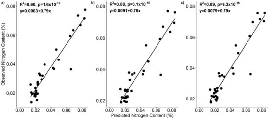 Scatterplots were constructed for optimal performing RF, GB, and XG models to relate the observed and predicted soil nitrogen content in Figure 5. The data points are close to the diagonal line for all three models, indicating a good agreement between the observed and predicted values. The RF4 model had a slightly better performance R2 (R2 = 0.90) than the other models and was statistically significant (p = 1.6 × 10−16) at a 95% confidence interval. The GB and XG models had similar R2 values (R2 = 0.88 and R2 = 0.89). However, GB had a higher p-value of 3.1 × 10−15 in comparison to XG with a p-value of 6.3 × 10−16. Both models were statistically significant at a 95% confidence interval.