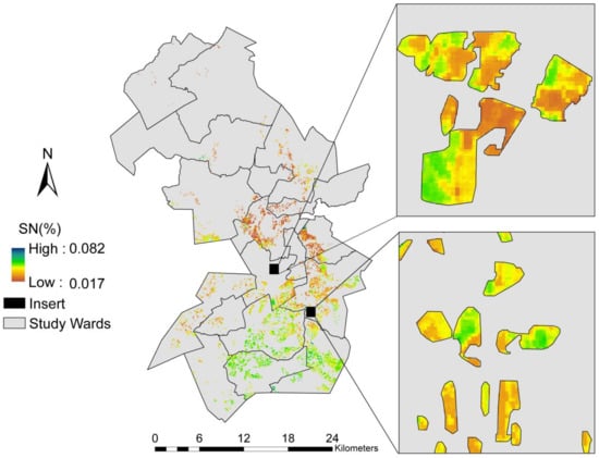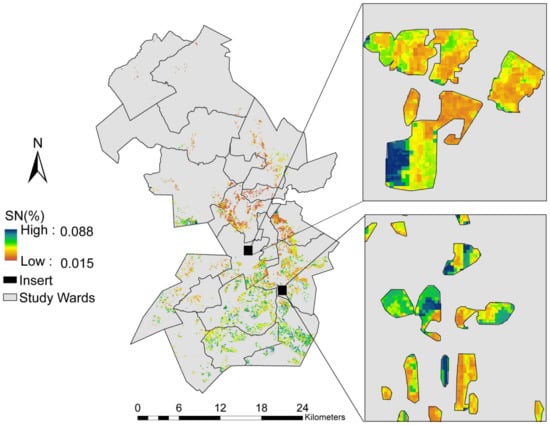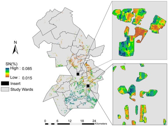 Improving soil nutrient management at smallholder maize (Zea mays L.) farms is imperative for ensuring food security in developing countries. Smallholder maize farms are crucial for the livelihoods of rural communities in Africa who depend on agriculture for food security and their local economic activities. Amongst the most important nutrients is nitrogen; not only is it a component of the chlorophyll molecule but is also essential for maize growth, quality, and yield [,,]. The soil is one of the most important nitrogen reservoirs in terrestrial ecosystems []. Developing frameworks to map the spatial variability of soil nitrogen is necessary for the local government, farmers, and stakeholders to identify nitrogen excesses or deficiencies. Such information will guide soil fertility interventions at smallholder farms. In the long term, improved soil nitrogen content management will enhance maize productivity [,]. This application is particularly important for resource limited smallholder maize farms such as those in developing countries, for example South Africa, which have reported sub-optimal yields, infertile land, and land degradation in previous studies [,].