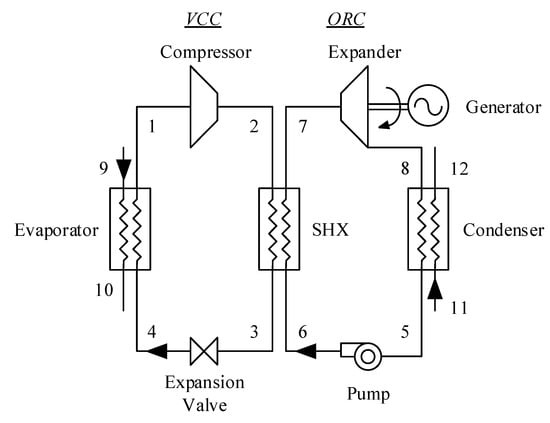 In this section, an integrated vapor compression cycle (VCC) and organic Rankine cycle system (ORC) for low-grade waste heat recovery is presented. Figure 1 shows the proposed configuration of the integrated VCC-ORC system. In this approach, the waste heat rejected by the condenser of the VCC (state points 2–3) system is fully recovered by a shared heat exchanger to drive the ORC system. The VCC system primarily consists of a compressor, a shared heat exchanger (SHX), an expansion valve and an evaporator, while in the ORC, the expander, condenser, pump and evaporator (shared heat exchanger) are the main components. The SHX between the VCC and ORC works as the condenser in the VCC as well as the evaporator in the ORC. In the VCC, the low-pressure vapor (state 1) is compressed and exits as high-pressure superheated vapor (state 2). Through condensation, the high-pressure superheated vapor is liquefied (state 3) by the ORC working fluid. The low-pressure saturated refrigerant liquid and vapor leave the expansion valve (state 4) and enter the evaporator. The evaporation process cools the return chilled water (state 9) to the chilled water supply (state 10). In the ORC, the low-pressure liquid (state 5) is pumped to high pressure (state 6) and delivered to the evaporator. The high-pressure vapor (state 7) flows out of the evaporator after gaining heat and then enters the turbine. The expansion process in the turbine produces mechanical power that drives the generator to produce electricity. The low-pressure vapor (state 8) is cooled and condensed by cooling water (from state 11 to state 12). Overall, the i-VCC-ORC system produces a cooling effect and converts the waste heat rejected into electricity. The T-s diagram of the system is shown in Figure 2.