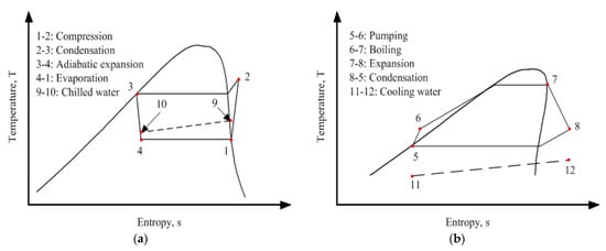T-s diagrams of (a) vapor compression cycle and (b) Organic Rankine cycle.