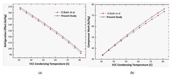 The validation results of the present VCC system against those in O. Badr et al. [27] for the COP of the standalone VCC, compressor work and refrigeration effect are shown in Figure 3 and Figure 4. The operating conditions in this case are a VCC condensing temperature = 40 °C, compressor isentropic efficiency = 70% and evaporating temperature = −20 °C. Moreover, the temperature differences for the evaporator and high-temperature reservoir and between the condenser and low-temperature reservoir are kept constant at 5 °C. The VCC system is validated for the VCC condensing temperature against the VCC COP, compressor work and refrigeration effect for the isentropic refrigerant R22.
