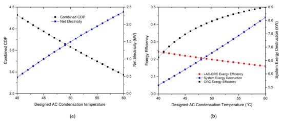 (a) Designed VCC condensation temperature vs. Net COP and Net electricity, (b) Designed VCC condensation temperature vs. Exergy Efficiency and System exergy destruction.