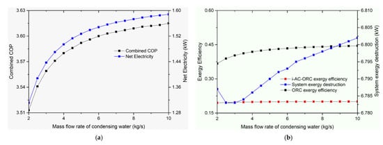 (a) Mass flow rate of condensing water vs. Net COP and Net electricity, (b) Mass flow rate of condensing water vs. Exergy Efficiency and System exergy destruction.