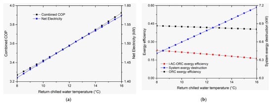 Figure 8a shows the trend of the net COP and net electricity with a changing return chilled water temperature. The net COP values ranges from 3.43 to 3.65 with a value of 3.54 at a return chilled water temperature of 12 °C. Similarly, the variation of net electricity is almost the same, ranging from 1.413 to 1.411 kW with a value of 1.41 kW at 12 °C. With an increase in the return chilled temperature, both the ORC exergy efficiency and i-VCC-ORC exergy efficiency decrease slightly with an increase in the system exergy destruction as shown in Figure 8b.
