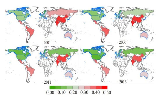 Figure 1. Distributions of MEPI in 2001, 2006, 2011 and 2016. Note: countries with blue border is developed economies, countries with blank is missing data, the other countries is emerging countries.